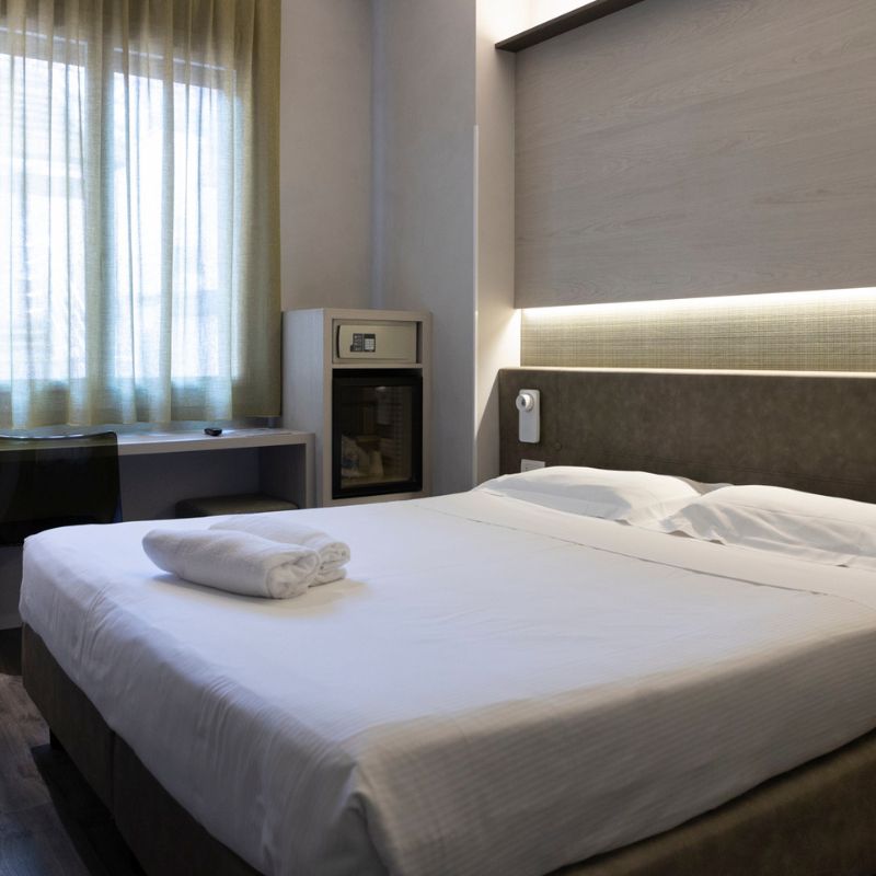 Offriamo 91 camere confortevoli e funzionali, dotate di ogni servizio per garantire il massimo relax. Inoltre, mettiamo a disposizione tre sale meeting attrezzate, una spaziosa sala colazioni, bar aperto 24h, Wi-Fi gratuito in tutta la struttura e un garage privato per chi arriva in auto.